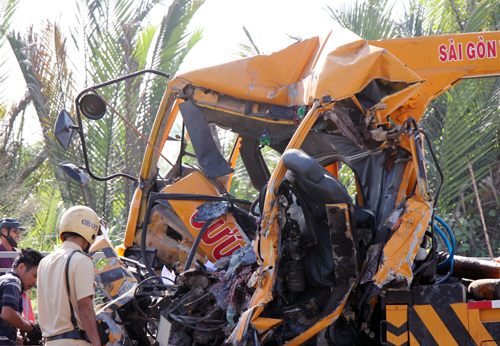 Tuy nhiên, khi vừa đổ dốc cầu Phú Mỹ (phường Thạnh Mỹ Lợi, quận 2), tài xế Giang đã để xe lao vào sau xe đầu kéo container đang chạy chậm phía trước. Cú tông kinh hoàng khiến xe cẩu cứu hộ bép dúm, cả 3 nạn nhân dính chặt trong cabin biến dạng hoàn toàn.