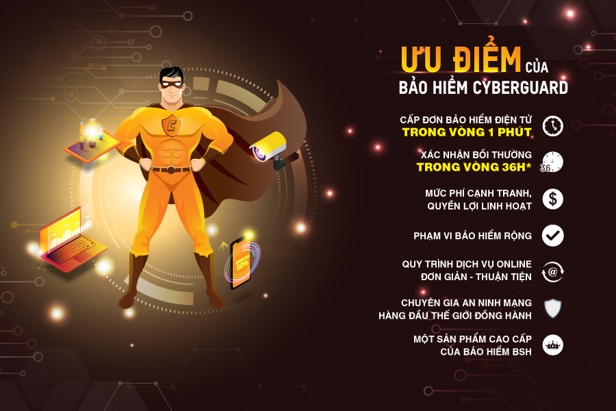 CyberGuard của BSH - sản phẩm bảo hiểm tiên phong tại Việt Nam cung cấp các quyền lợi bảo vệ khách hàng trước các rủi ro trên không gian mạng như: lừa đảo lấy mất tiền trong tài khoản ví điện tử/ngân hàng; lừa đảo thực hiện các giao dịch không có thật trong mua sắm trực tuyến; bị tống tiền trên mạng; chi phí phục hồi dữ liệu bị mất sau sự cố tấn công mạng; thiệt hại gây ra do bị hack/trộm cắp danh tính.