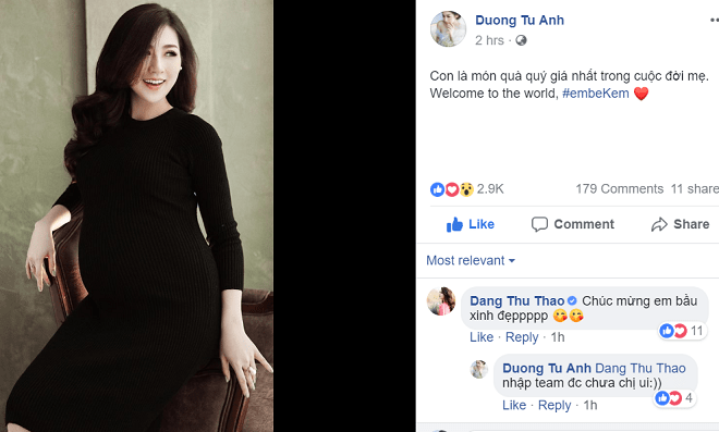 Đăng tải bức ảnh ghi lại khoảnh khắc bầu bí xinh đẹp rạng rỡ, Tú Anh thông báo: "Con là món quà quý giá nhất trong cuộc đời mẹ. Welcome to the world - Chào đón con đến với thế giới này".