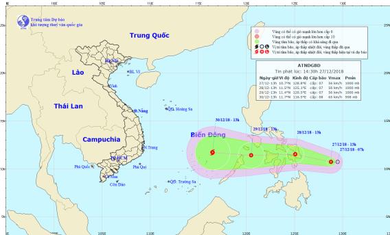 Trong 48 đến 72 giờ tiếp theo, áp thấp nhiệt đới di chuyển theo hướng Tây, mỗi giờ đi được 20-25km, đi vào Biển Đông sau đó có khả năng mạnh lên thành bão. Đến 13h ngày 30/12, vị trí tâm bão ở khoảng 11,7 độ Vĩ Bắc; 116,5 độ Kinh Đông, cách đảo Song Tử Tây (quần đảo Trường Sa) khoảng 240km về phía Đông. Sức gió mạnh nhất vùng gần tâm bão mạnh cấp 8 (60-75km/giờ), giật cấp 10. Cấp độ rủi ro thiên tai: cấp 3.