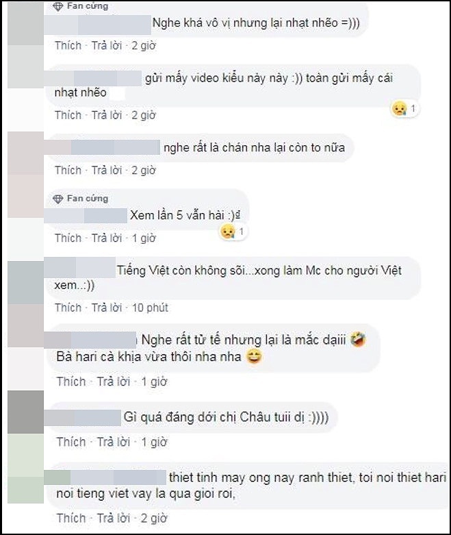 Tuy nhiên, lại có một số ý kiến tỏ ra gay gắt với nữ ca sĩ và viết “Tiếng Việt còn không sõi xong làm MC cho người Việt xem”, “Qua Việt Nam mười mấy năm vẫn ngọng được”, “Biết thế bà đừng nói thế là xong”,..