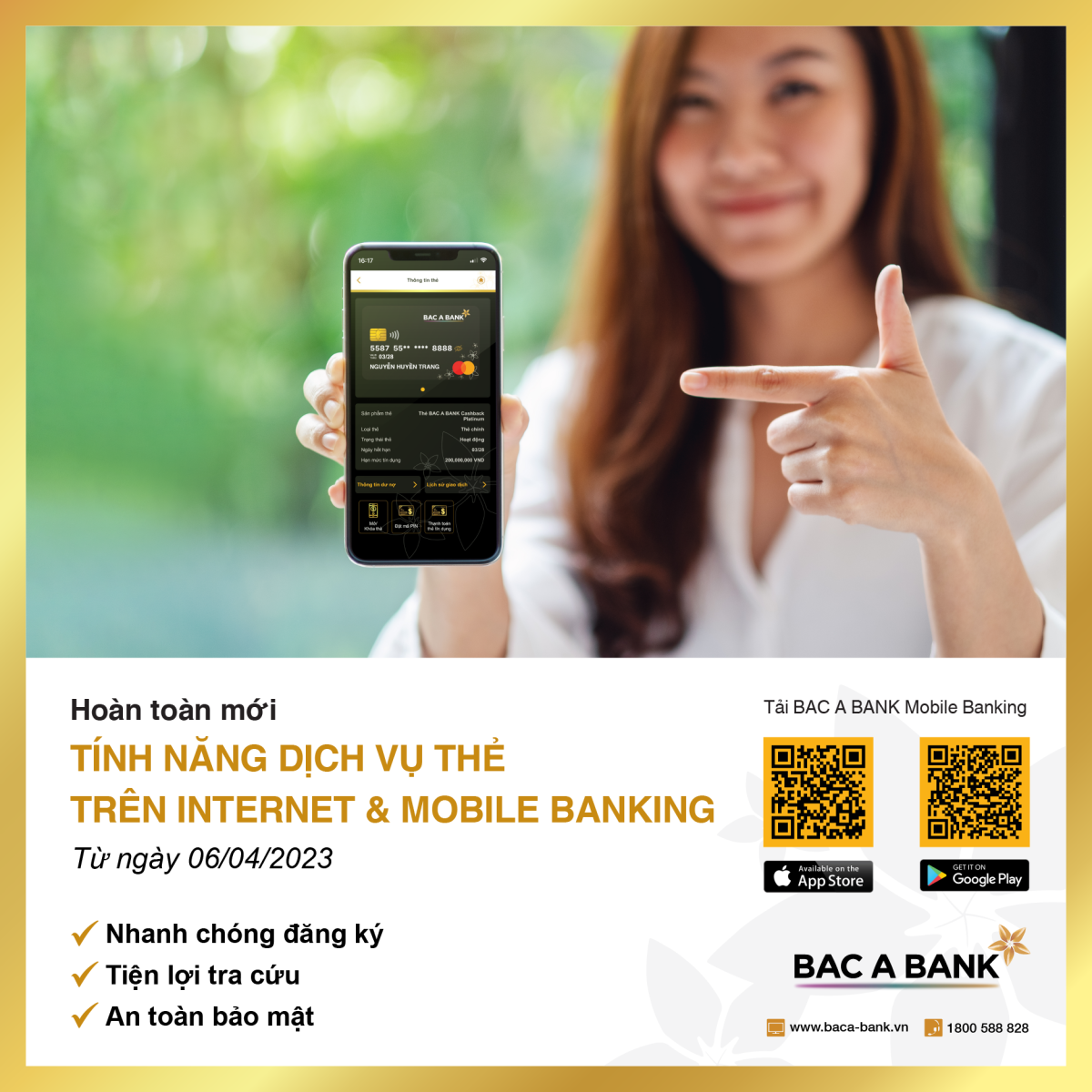 Nhanh tay cập nhật app BAC A BANK trên hệ thống iOS: http://bit.ly/BACABANK hoặc Android: http://bit.ly/BACABANKGooglePlay để trải nghiệm giao diện tra cứu và quản lý thẻ thông minh, tích hợp đầy đủ các dịch vụ thẻ thiết yếu. Ngoài những đặc điểm nổi bật của thẻ ghi nợ BAC A BANK như Danh mục phí 0 đồng lên đến gần 20 loại dịch vụ, chương trình ưu đãi quanh năm từ hệ thống TH truemart; sản phẩm mới ra mắt - thẻ tín dụng quốc tế BAC A BANK MasterCard - bước đầu ghi nhận sự quan tâm, ưa thích bởi vô vàn ưu đãi đặc quyền dành riêng cho từng loại thẻ.
