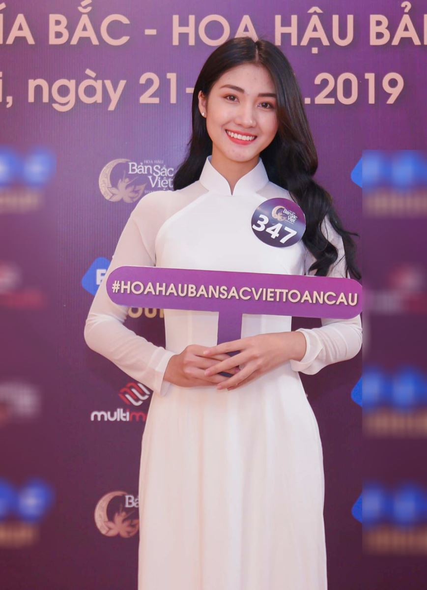 Nguyễn Thị Huyền Trang - bạn gái cầu thủ Trọng Đại xuất hiện trong buổi sơ khảo cuộc thi Hoa hậu Bản sắc Việt toàn cầu 2019.