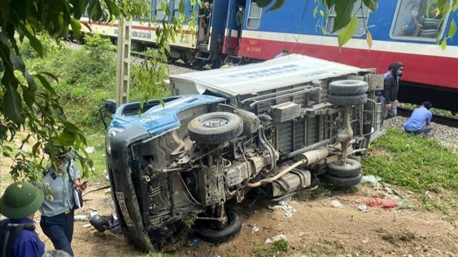 Đúng lúc đó, tàu hỏa chở khách chạy hướng Bắc - Nam đi tới đâm trúng. Cú đâm mạnh làm chiếc xe tải bị đẩy xa khoảng 10m, nằm lật bên đường.
