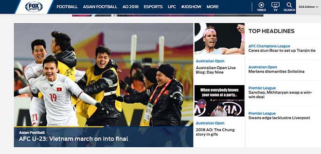 Trong khi đó, tờ Fox Sports phiên bản châu Á cũng dành những lời ca ngợi cho màn trình diễn thuyết phục của U23 Việt Nam. Tờ báo này cũng đưa chiến thắng nghẹt thở của U23 Việt Nam lên trang nhất, trong đó hình ảnh nổi bật nhất chính là Quang Hải.