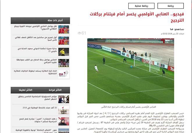 Tờ Alarab của Qatar giật hàng tít lớn trên trang nhất: "Olympic Qatar thất bại trước Việt Nam trên chấm phạt đền". Phóng viên Changju-Qena của Alareb ca ngợi U23 Việt Nam là đội bóng "quả cảm, giàu tham vọng và xứng đáng đi vào trận chung kết".
