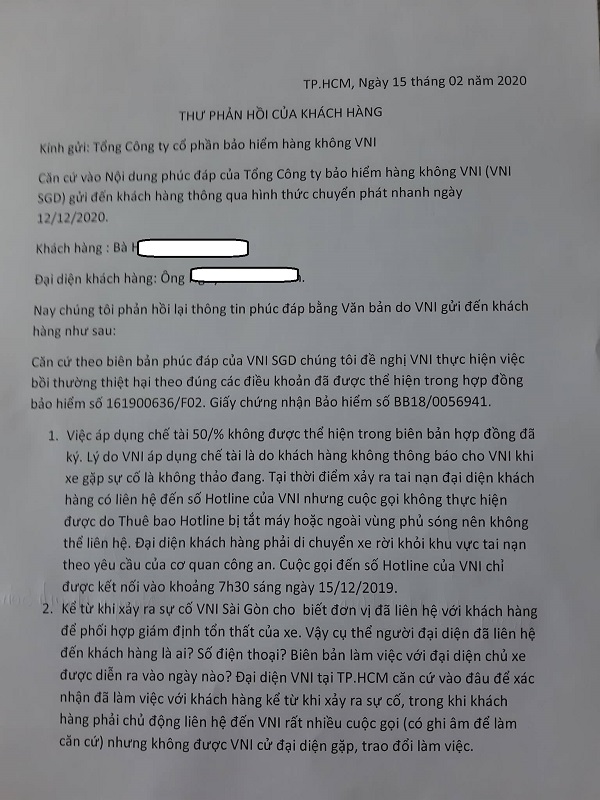 Không đồng tình với cách trả lời từ phía Tổng công ty bảo hiểm hàng không VNI, ngày 15/2, khách hàng tiếp tục gửi văn bản phản hồi chính thức đến VNI. Văn bản khách hàng phản hồi nêu các nội dung yêu cầu phía Tổng công ty VNI cần phải giải đáp rõ các khúc mắc trong văn bản phản hồi ngày 07/2, cũng như yêu cầu VNI thực hiện đúng theo các điều khoản đã ký kết trong hợp đồng bảo hiểm đã ký giữa các bên.