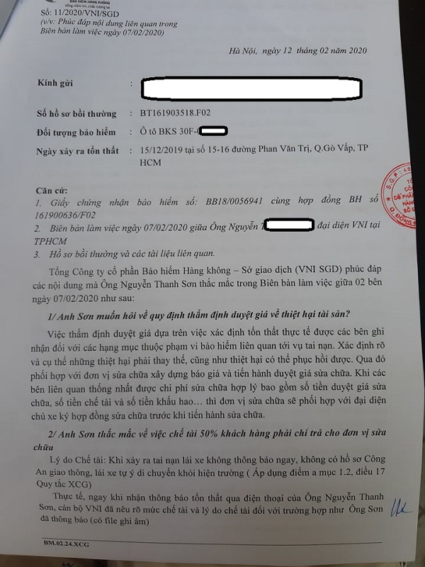 Cụ thể, trong văn bản khách hàng có nêu một số khúc mắc như: Việc áp dụng chế tài 50% đối với khách hàng có được VNI nêu lên trong các điều khoản trong hợp đồng đã ký với khách hàng không? Việc VNI Sài Gòn cho biết đơn vị đã liên hệ với khách hàng để phối hợp giám định tổn thất của xe, cụ thể người đại diện đã liên hệ đến khách hàng là ai, số điện thoại nào? Biên bản làm việc với đại diện chủ xe được diễn ra vào ngày nào? Đại diện VNI tại TP.HCM căn cứ vào đâu để xác nhận đã làm việc với khách hàng kể từ khi xảy ra sự cố, trong khi khách hàng phải chủ động liên hệ đến VNI rất nhiều cuộc gọi (có ghi âm để làm căn cứ) nhưng không được VNI cử đại diện gặp, trao đổi làm việc.