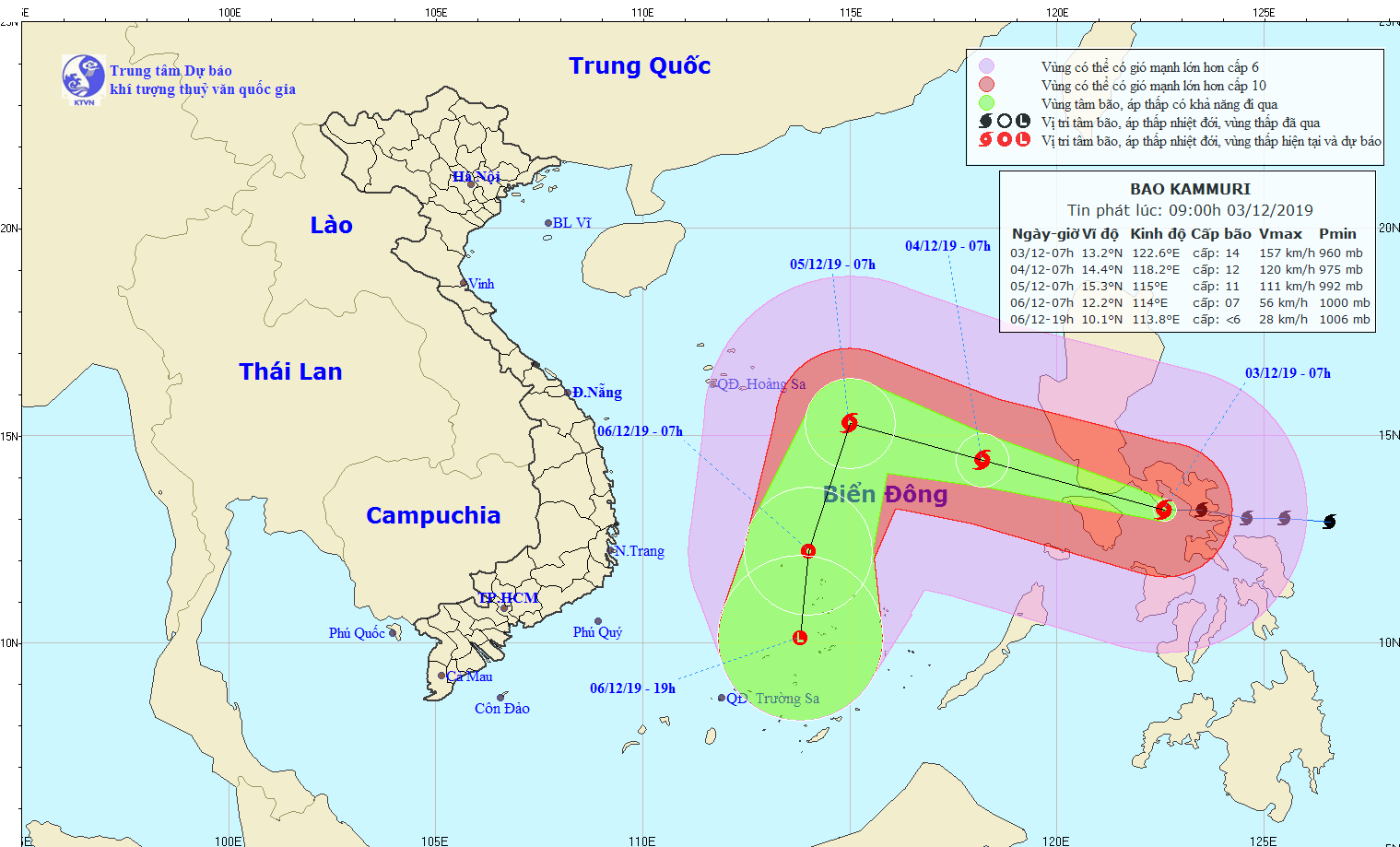 Dự báo trong 24 giờ tới, bão di chuyển theo hướng Tây Tây Bắc, mỗi giờ đi được 15-20km và đi vào Biển Đông. Đến 07 giờ ngày 04/12, vị trí tâm bão ở khoảng 14,4 độ Vĩ Bắc; 118,2 độ Kinh Đông, cách đảo Song Tử Tây khoảng 550km về phía Đông Bắc. Sức gió mạnh nhất vùng gần tâm bão mạnh cấp 11-12 (100-135km/giờ), giật cấp 15. Cấp độ rủi ro thiên tai: cấp 3.