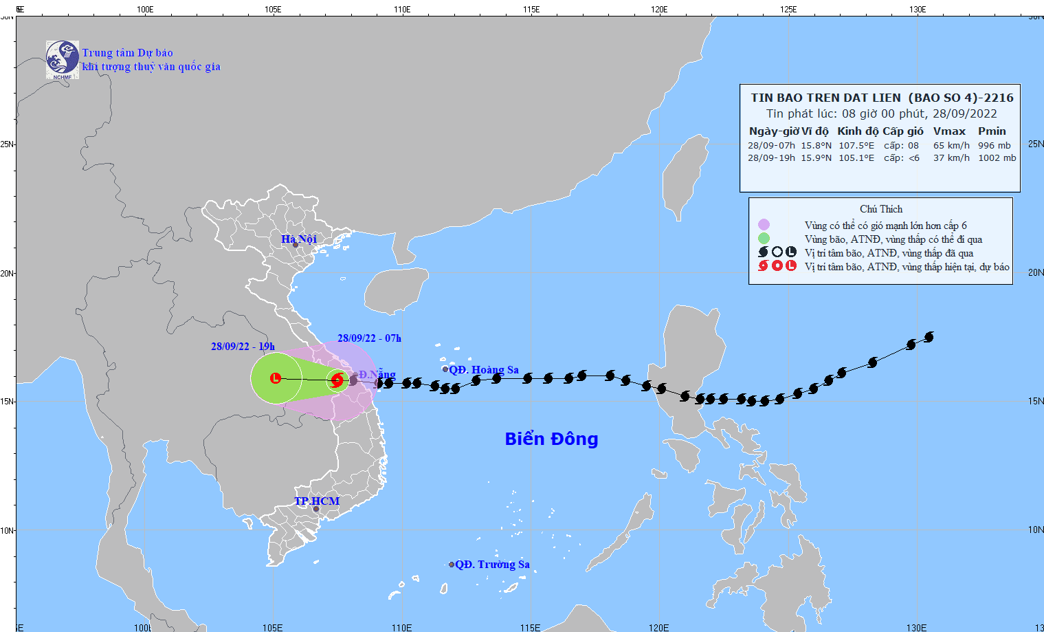 Hồi 7 giờ ngày 28/9, vị trí tâm bão ở khoảng 15,8 độ Vĩ Bắc; 107,5 độ Kinh Đông, trên đất liền khu vực Thừa Thiên - Huế đến Quảng Ngãi. Sức gió mạnh nhất vùng gần tâm bão mạnh cấp 8 (62 - 74 km/giờ), giật cấp 10. Bán kính gió mạnh từ cấp 6, giật từ cấp 8 trở lên khoảng 120 km tính từ tâm bão.