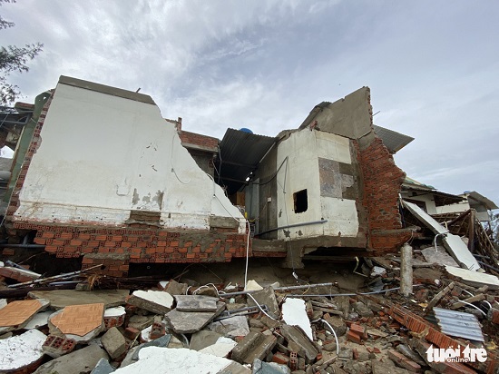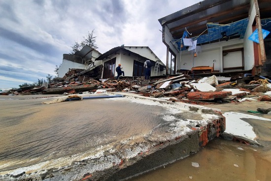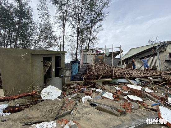 Khu nhà hàng của ông Nguyễn Văn Ba, khối Thịnh Mỹ bị sóng lớn, gió to vào đêm và rạng sáng nay đánh sập mái, công trình vệ sinh sạt xuống bờ biển. Theo chủ của villa này, vào rạng sáng nay do ảnh hưởng của bão khiến cột sóng rất cao, đánh vào khu vila khiến nhiều phòng bị sụp đổ xuống. "Phần tường và móng nứt toác, đổ vùi xuống, hư hỏng hoàn toàn, villa của chúng tôi bị thiệt hại quá nặng", chủ Vila cho biết.
