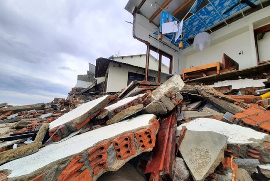 Những mảng tường của nhà hàng bị sóng đánh sụp đổ, nát tương, khiến nhà hàng này tan hoang, thiệt hại nặng nề. Đến sáng cùng người, chủ nhà hàng đã huy động nhân viên ra dọn dẹp.