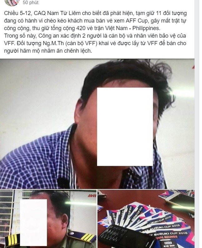 Theo lãnh đạo Công an quận Nam Từ Liêm, trong số 100 chiếc vé cơ quan công an thu giữ được thì có 4 cặp vé mời khán đài A do ông Trịnh Ngọc Tr. chào bán. Khi người bảo vệ này đang giao dịch cho một người hâm mộ với giá 4,5 triệu đồng thì bị bắt quả tang.