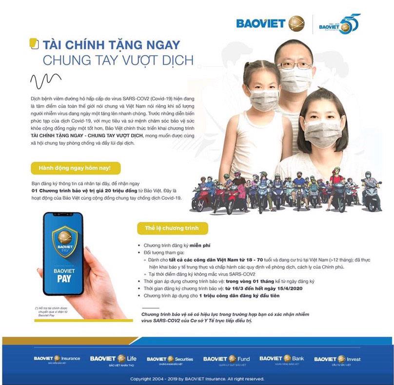 “Tài chính tặng ngay - Chung tay vượt dịch” là hoạt động của Bảo Việt cùng cộng đồng chung tay phòng chống và đẩy lùi đại dịch SARS-CoV-2. Theo đó, Bảo Việt sẽ hỗ trợ tài chính 20 triệu đồng/ ca nhiễm SARS-CoV-2 dành cho một triệu công dân Việt Nam đầu tiên đăng ký tham gia chương trình với thể lệ chương trình như sau:
