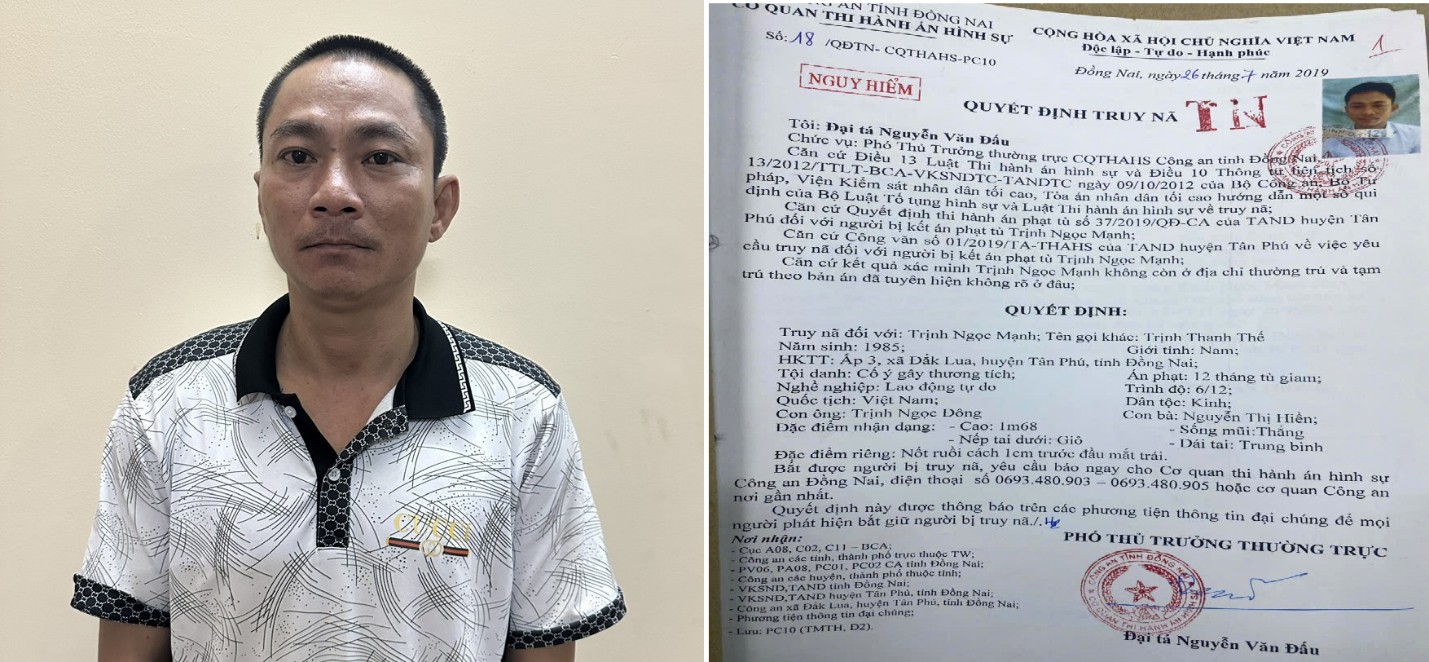 Công an tỉnh Đồng Nai thông tin, ngày 2/5, Phòng Cảnh sát thi hành án hình sự và hỗ trợ tư pháp Công an tỉnh đã bắt đối tượng truy nã Trịnh Ngọc Mạnh (tên gọi khác Trịnh Thanh Thế) (40 tuổi) ngụ tỉnh Đồng Nai tội cố ý gây thương tích.
