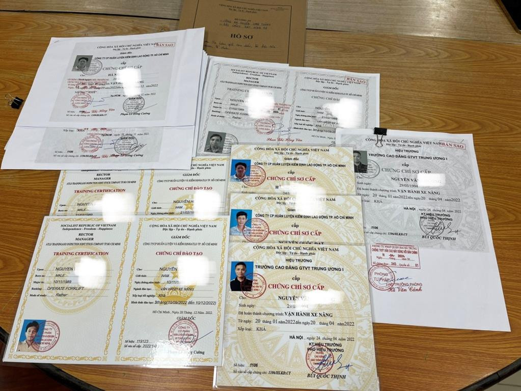 Theo Công an nhân dân, khám xét tại nơi ở của các đối tượng, Cơ quan Cảnh sát điều tra đã thu giữ 9 chứng chỉ sơ cấp của Trường Cao đẳng Giao thông vận tải Trung ương 1; 18 bản sao công chứng của Phòng công chứng quận Hai Bà Trưng, TP.Hà Nội cùng nhiều tài liệu, vật chứng liên quan.
