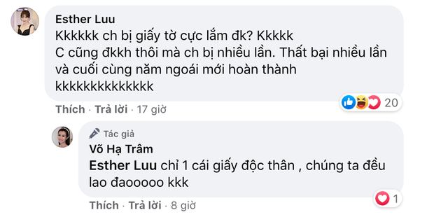 "Em bị giấy tờ cực lắm đúng không? Chị cũng đăng ký kết hôn thôi mà cũng bị nhiều lần. Thất bại nhiều lần và cuối cùng năm ngoái mới hoàn thành", Hari Won chia sẻ. Sau đó, Võ Hạ Trâm cũng phản hồi: "Chỉ 1 cái giấy độc thân, chúng ta đều lao đao".