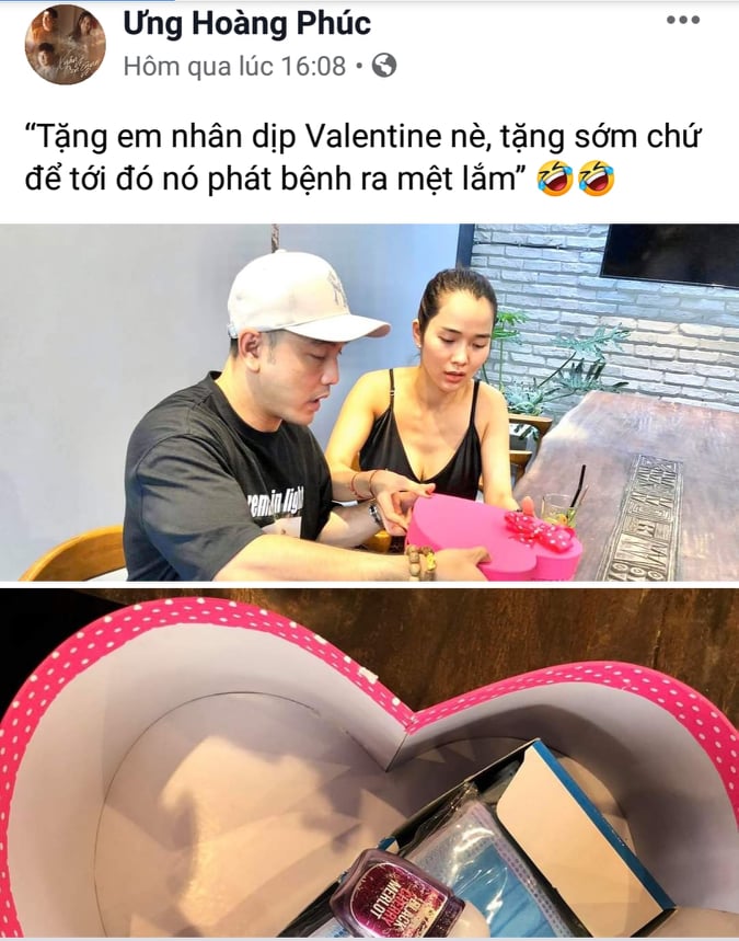 Mới đây, trên trang facebook cá nhân, Ưng Hoàng Phúc khiến fans bất ngờ khi đăng tải bức hình cùng vợ khui quà kỷ niệm lễ tình nhân sớm, kèm theo đó là dòng trạng thái hài hước: "Tặng em nhân dịp Valentine nè, tặng sớm chứ để tới đó nó phát bệnh ra mệt lắm".