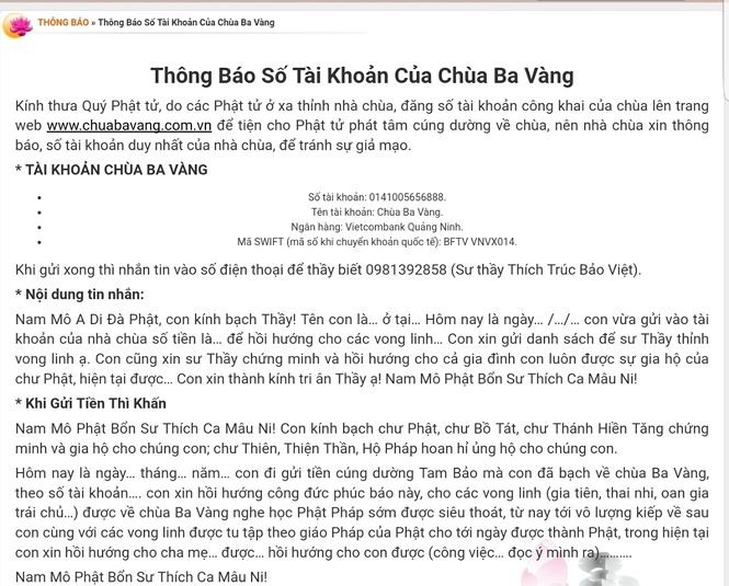 Trước đó, không chỉ trang chủ của chùa Ba Vàng (chuabavang.com.vn) mà hai trang web khác là thichtructhaiminh.com và phamthiyen.com đều từng đăng tải nhiều thông tin về hoạt động cúng vong oan gia trái chủ.