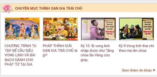 Điều đặc biệt, trong website việc thỉnh oan gia trái chủ được lập một chuyên mục riêng. Trong những bài viết, nhà chùa đã đầu tư rất kỹ lưỡng về mặt câu chữ, ảnh, video. Nội dung xuất hiện nhiều tin bài về việc con người bị bệnh tật, hoạn nạn do vong báo oán xuất phát từ nhiều kiếp trước. Để hóa giải được kiếp nạn, họ phải phát tâm cúng dường cho nhà chùa dưới sự hỗ trợ, dẫn dắt của một người phụ nữ tên Phạm Thị Yến.