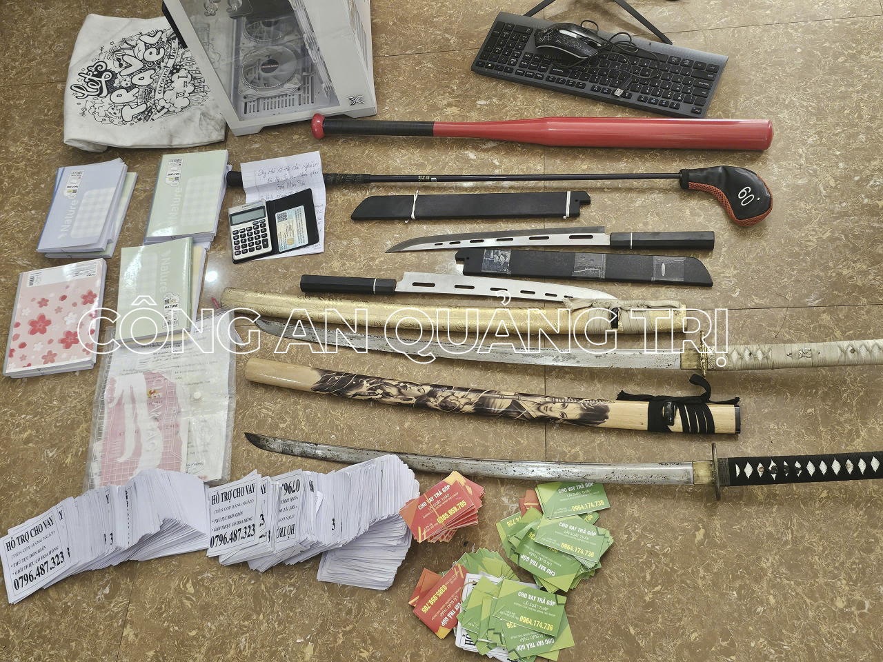 Cơ quan Cảnh sát điều tra đã tiến hành khám xét khẩn cấp nơi ở của các đối tượng trên, thu giữ 10 điện thoại di động, 2 máy tính để bàn, 2 con dao, 2 cây kiếm cùng nhiều tài liệu liên quan.