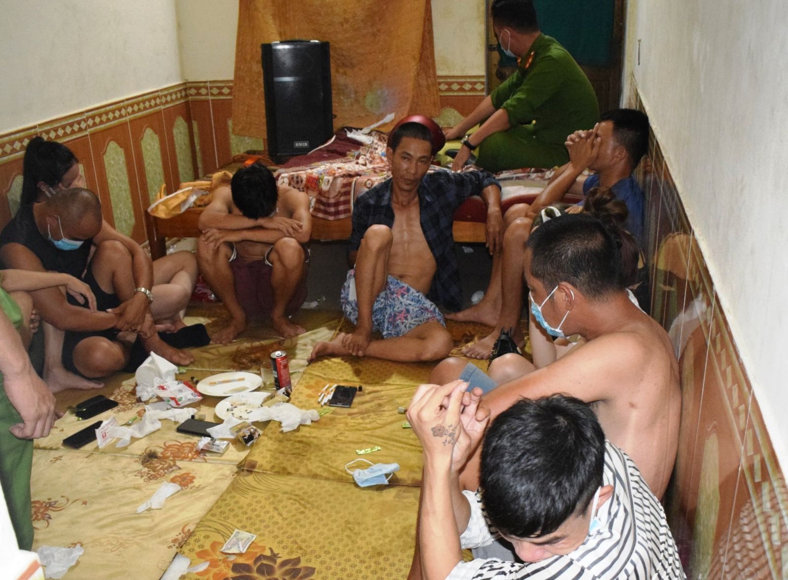 Tại đây, tổ công tác phát hiện, thu giữ các đồ vật, tài liệu để sử dụng ma túy, trong đó có 1 dĩa sứ có chứa các tinh thể màu trắng đục nghi là ma túy tổng hợp. Tiến hành test nhanh chất ma túy với 12 người này, kết quả cả 12 dân chơi đều dương tính với chất ma túy.
