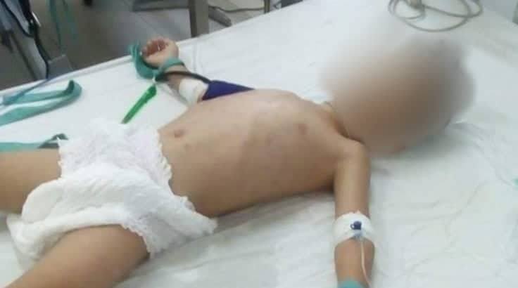 Sau khi bị bạo hành, trên người cháu L. xuất hiện rất nhiều vết bầm tím, cháu L. được người thân đưa vào bệnh viện với tình trạng hôn mê, rất nguy kịch.