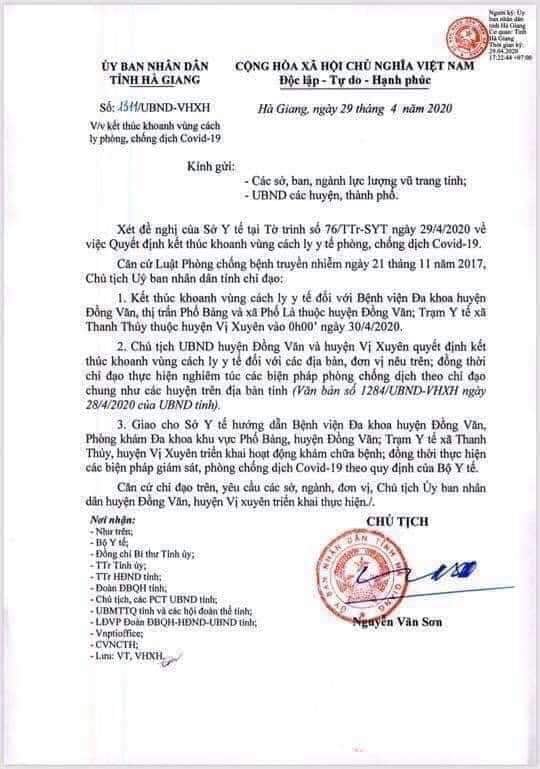 * Ngày 29/4, Chủ tịch UBND tỉnh Hà Giang cũng đã có văn bản về việc kết thúc khoanh vùng cách ly y tế phòng chống dịch COVID-19 đối với BVĐK Đồng Văn, thị trấn Phố Bảng và xã Phố Là thuộc huyện Đồng Văn; Trạm y tế xã Thanh Thủy thuộc huyện Vị Xuyên từ 0h ngày 30/4/2020.