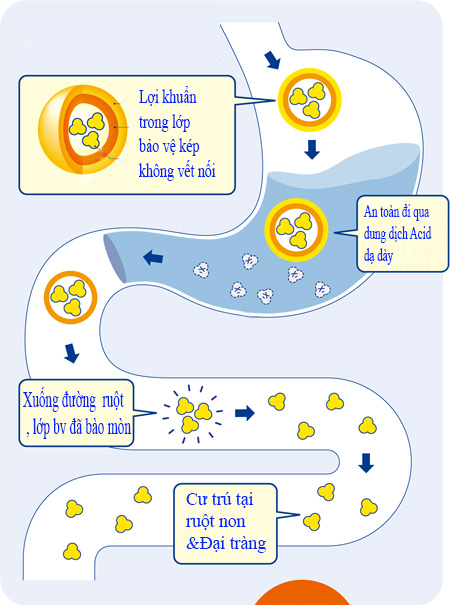 Tuy nhiên lợi khuẩn Bifido lại dễ bị tiêu diệt bởi axit dạ dày nên các men vi sinh thông thường không chứa thành phần Bifido. Người Nhật Bản đã rất thông minh khi áp dụng công nghệ đột phá, bảo vệ SMC (Seamless Micro Capsule) bảo vệ lợi khuẩn sống trong viên nang hình cầu liền mạch không vết nối, có 2 lớp màng bọc kép kháng axit giúp đưa lợi khuẩn sống đi qua axit dạ dày vào tận ruột non và đại tràng đạt tỷ lệ trên 90%, giúp cân bằng hệ vi sinh đường ruột, tái tạo hệ lông nhung và dịch nhầy, tái tạo lớp lá chắn kép bảo vệ đại tràng, cải thiện các triệu chứng khó chịu.