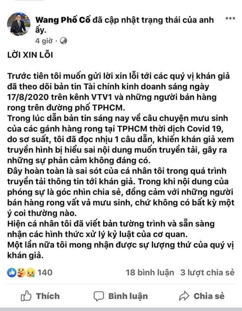 "Trước tiên tôi muốn gửi lời xin lỗi tới các quý vị khán giả đã theo dõi bản tin Tài chính kinh doanh sáng ngày 17/8/2020 trên kênh VTV1 và những người bán hàng rong trên đường phố TP.HCM.