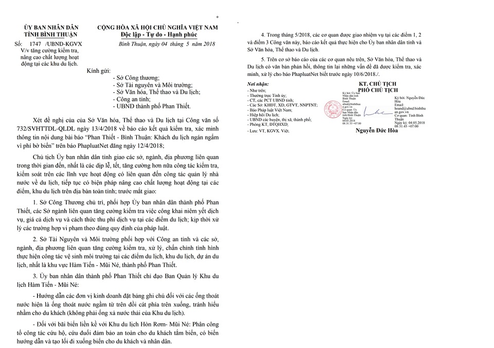 Văn bản số 1747/UBND- KGVX nêu rõ, xét đề nghị của của Sở Văn hóa, Thể thao và Du lịch tại Công văn số 732/SVHTTDL-QLDL ngày 13/4/2018 về báo cáo kết quả kiểm tra, xác minh thông tin nội dung bài báo “Phan Thiết - Bình Thuận: Khách du lịch ngán ngẩm vì phí bờ biển” trên báo PhapluatNet đăng ngày 12/4/2018.