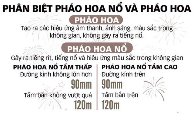 Theo Bộ Công an, pháo hoa mà các cơ quan, tổ chức, cá nhân được sử dụng là loại pháo được chế tạo, sản xuất thủ công hoặc công nghiệp, khi có tác động của xung kích thích cơ, nhiệt, hóa hoặc điện tạo ra các hiệu ứng âm thanh, màu sắc, ánh sáng trong không gian, không gây ra tiếng nổ (điểm b Khoản 1 Điều 3 Nghị định 137 quy định).