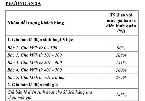 Với Phương án 1: Cơ cấu biểu giá bán lẻ điện cho mục đích sinh hoạt sẽ chỉ có 5 bậc. Bậc 1 áp dụng cho kWh từ 0 – 100 (gộp bậc 1 và 2 trong biểu 6 bậc và tăng từ 0-100kW) và tính bằng 90% mức giá bán lẻ điện bình quân. Bậc 2 áp dụng cho kWh từ 101 – 200 và tính bằng 108% mức giá bán lẻ điện bậc 3.