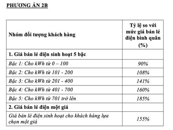 Tỉ lệ giá bán lẻ so với mức giá bán lẻ điện bình quân ở phương án 2B dành cho khách hàng chọn hình thức điện một giá là 155% mức giá điện bình quân, tương ứng 2.889,88 đồng/kWh (chưa bao gồm VAT).