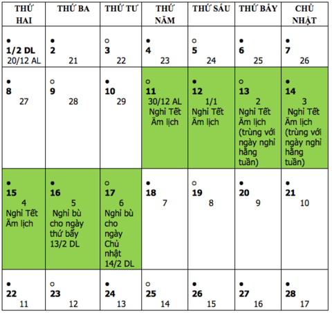 Phương án 1: Công chức, viên chức nghỉ Tết Âm lịch là 7 ngày liên tục nhưng nghỉ hai ngày trước Tết, ba ngày sau Tết. Do ngày mùng 2 và mùng 3 Tết Âm lịch (tức ngày 13-14/2/2021 Dương lịch) trùng vào thứ Bảy và Chủ Nhật là ngày nghỉ hằng tuần, công chức, viên chức sẽ nghỉ bù vào ngày mùng 4 và mùng 5 Tết Âm lịch (tức ngày 15-16/2/2021 Dương lịch).