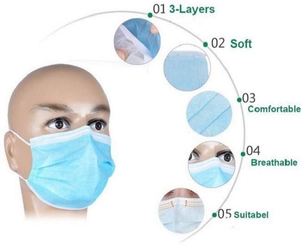 - Khi đeo khẩu trang, phải để mặt xanh ra ngoài do mặt này có tính chống nước, các giọt nước bọt lớn bắn vào sẽ không thấm vào trong, có thể rơi xuống. Mặt màu trắng có tính hút ẩm nên quay vào trong, để hơi thở thoát ra thấm vào khẩu trang.