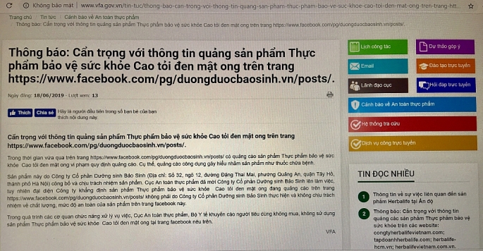 Cục An toàn thực phẩm đã mời Công ty Cổ phần Dưỡng sinh Bảo Sinh lên làm việc, tuy nhiên đại diện Công ty khẳng định sản phẩm Thực phẩm bảo vệ sức khỏe Cao tỏi đen mật ong đang quảng cáo trên trang https://www.facebook.com/pg/duongduocbaosinh.vn/posts/ không phải do Công ty Cổ phần Dưỡng sinh Bảo Sinh thực hiện và không chịu trách nhiệm về chất lượng, mức độ an toàn của sản phẩm trên trang facebook này.