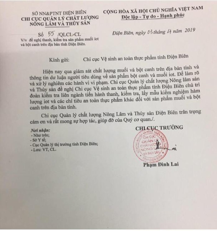Sau khi kiểm tra, thực hiện kiểm nghiệm đúng quy trình, Chi cục Quản lý chất lượng Nông Lâm và Thủy sản đã làm rất đúng là phát đi thông báo đến các cơ quan chức năng ở các tỉnh, thành về việc chất lượng “có vấn đề”, bột canh i-ốt Hải Châu và một số sản phẩm muối, bột canh khác ghi trên bao bì có hàm lượng i-ốt nhưng không đạt, thậm chí bột canh tên i-ốt Hải Châu ghi hàm lượng i-ốt rõ ràng trên bao bì nhưng không hề có i-ốt ở sản phẩm bày bán ra thị trường…