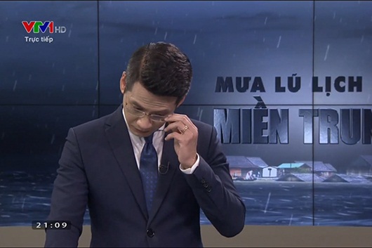 Đáng chú ý, khi nói về những thiệt hại, sự khốc liệt của thiên tai, mất mát và tang thương của miền Trung trong cơn bão vừa qua, BTV Tuấn Dương đã lặng người, nghẹn ngào nén khóc trên sóng trực tiếp.