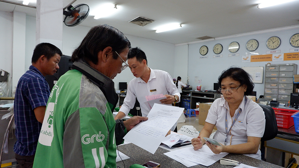 Tranh thủ vừa trả khách tại điểm cạnh Bưu điện trung tâm TP.HCM, ông Đỗ Cao Minh liền vào bưu cục để làm thủ tục cấp phiếu lý lịch tư pháp, hoàn thiện hồ sơ gửi công ty theo quy định. Ông Minh không nghĩ rằng chỉ mất 5 phút vừa khai thông tin vừa làm thủ tục tại quầy là xong hết thủ tục để tiếp tục công việc grapbike ngay sau đó. “Tôi tới Bưu điện để gửi hàng nhiều lần rồi, nhưng hôm nay mới có nhu cầu giải quyết thủ tục hành chính. Lâu nay cứ nghĩ khi đi làm giấy tờ hành chính sẽ bị nhũng nhiều, phiền hà, mất thời gian nên rất “ngại”. May quá có anh bạn vừa nộp phí phạt giao thông qua Bưu điện giới thiệu vào đây làm. Chỉ mất khoảng 30.000 VNĐ là tôi chả phải lo nghĩ gì nữa. Trưa nay làm thì ngày mai sẽ có bưu tá sẽ gọi điện, phát tại nhà, ông Minh chia sẻ.