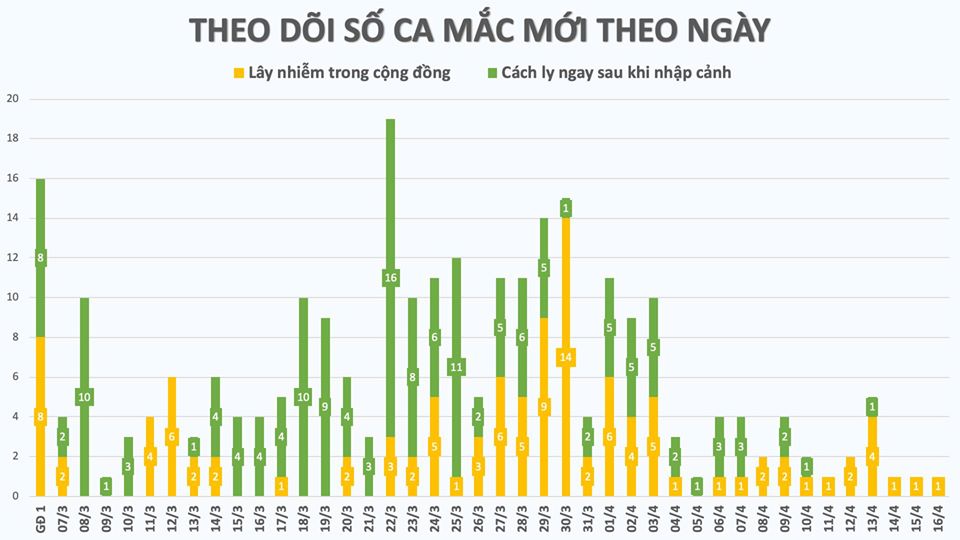 Trong 14 ngày vừa qua kể từ khi thực hiện Chỉ thị số 16 của Thủ tướng Chính phủ về thực hiện cách ly xã hội, 3 ngày đầu tiên (01-03/4) ghi nhận 30 trường hợp mắc mới, sau đó chỉ ghi nhân số mắc mới trong khoảng từ 1-5 trường hợp mỗi ngàyD