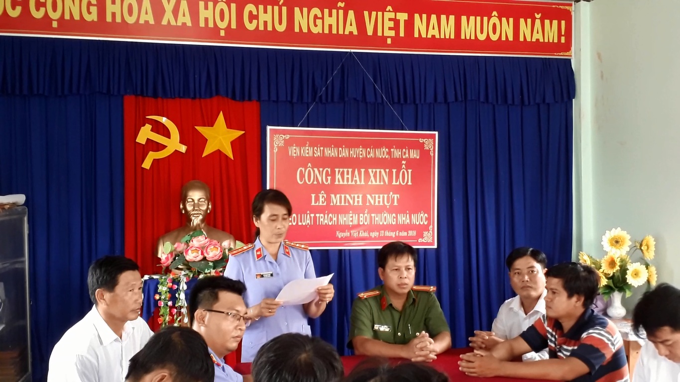 Ngày 13/6, VKSND huyện Cái Nước tổ chức buổi xin lỗi công khai đối với anh Nguyễn Hoàng Khang (SN 1995), Nguyễn Vũ Ca (SN 1996) cùng ngụ xã Lâm Hải, huyện Năm Căn, tỉnh Cà Mau và Lê Minh Nhựt (SN 1998, ngụ tại xã Nguyễn Việt Khái, huyện Cái Nước). Cả ba thanh niên trên đều bị truy tố oan tội Cướp tài sản.