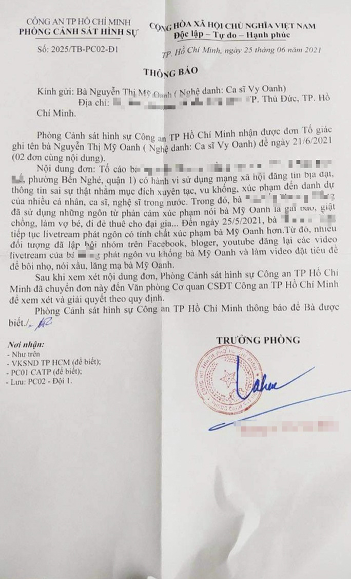 Mới đây, Phòng Cảnh sát hình sự - Công an TP.HCM vừa gửi thông báo xác nhận đã nhận được đơn tố giác của Nguyễn Thị Mỹ Oanh (ca sĩ Vy Oanh) về việc bà Nguyễn Phương Hằng (CEO Công ty CP Đại Nam) sử dụng mạng xã hội để đăng tải thông tin bịa đặt, sai sự thật, vu khống, xúc phạm đến danh dự của nhiều cá nhân, nghệ sĩ trong nước, trong đó có Vy Oanh.