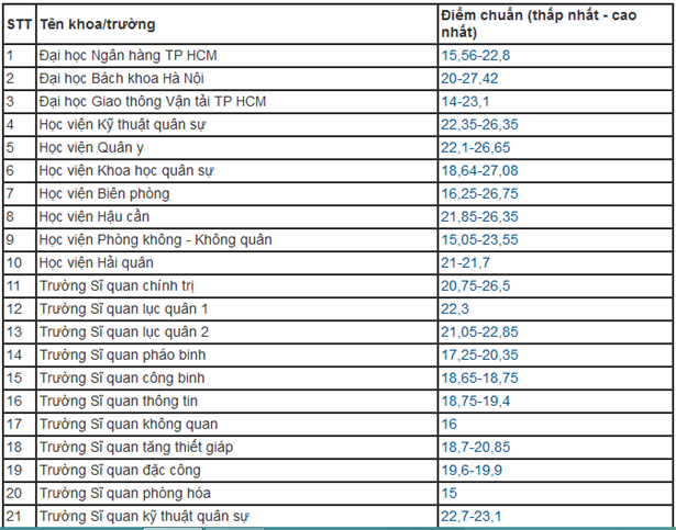 Khối trường quân đội tụt từ vị trí thứ nhất năm ngoái xuống thứ ba, cao nhất là 27,09 với thí sinh nữ ngành Ngôn ngữ Anh, Đại học Khoa học quân sự. Trường Sĩ quan Phòng hóa chỉ lấy 15 điểm - thấp hơn năm ngoái tới 5-6 điểm.