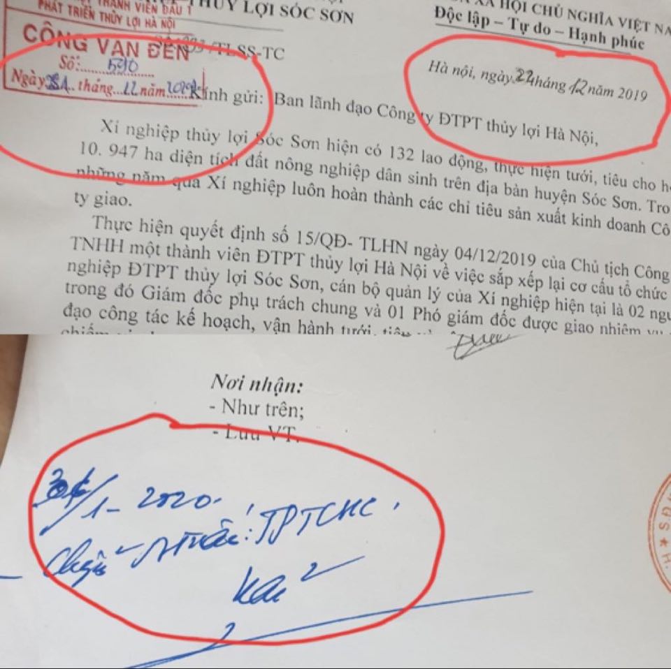 Nội dung đơn nêu rõ, ông Phan Tuy Hội ký quyết định bổ nhiệm ông Nguyễn Văn Huyền, con trai ông Nguyễn Văn Hải – Phó Tổng giám đốc phụ trách điều hành Công ty Thủy lợi Hà Nội làm Phó Giám đốc Xí nghiệp thủy lợi Sóc Sơn, xí nghiệp trực thuộc Công ty Thủy lợi Hà Nội. Ông Nguyễn Văn Huyền mới về Công ty Thủy lợi Hà Nội công tác được một năm, là nhân viên phòng kế hoạch kỹ thuật, cũng không nằm trong diện quy hoạch cấp tương đương. Việc bổ nhiệm cán bộ khi chưa đủ điều kiện bổ nhiệm là thực hiện sai so với Quyết định số 15/2019/QĐ-UBND ngày 11/9/2019 của UBND Thành phố Hà Nội. Đồng thời, việc bổ nhiệm ông Huyền không đưa ra ban thường vụ công ty họp bàn công khai dân chủ, lấy phiếu tín nhiệm là sai nguyên tắc điều lệ Đảng.