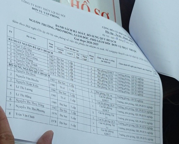 Theo một cán bộ của Công ty Thủy lợi Hà Nội (xin được giấu tên) cho biết: “Đến hết năm 2019, ông Nguyễn Văn Huyền không nằm trong danh sách cán bộ quy hoạch cấp phòng được công ty phê duyệt, nhưng không hiểu vì lý do gì, ông Hội lại bổ nhiệm ông Huyền về làm Phó Giám đốc xí nghiệp nước Sóc Sơn. Trong khi đầu năm 2019, cơ sở Sóc Sơn gửi đề nghị lên Công ty Thủy lợi Hà Nội yêu cầu bổ sung cán bộ lãnh đạo, đến giữa năm 2019 có gửi lại đề nghị lần nữa. Người được cơ sở đề xuất bổ nghiệm là bà Loan - cán bộ công tác lâu năm, có kinh nghiệm tại Xí nghiệp, tuy nhiên là bà Loan không được bổ nhiệm”.