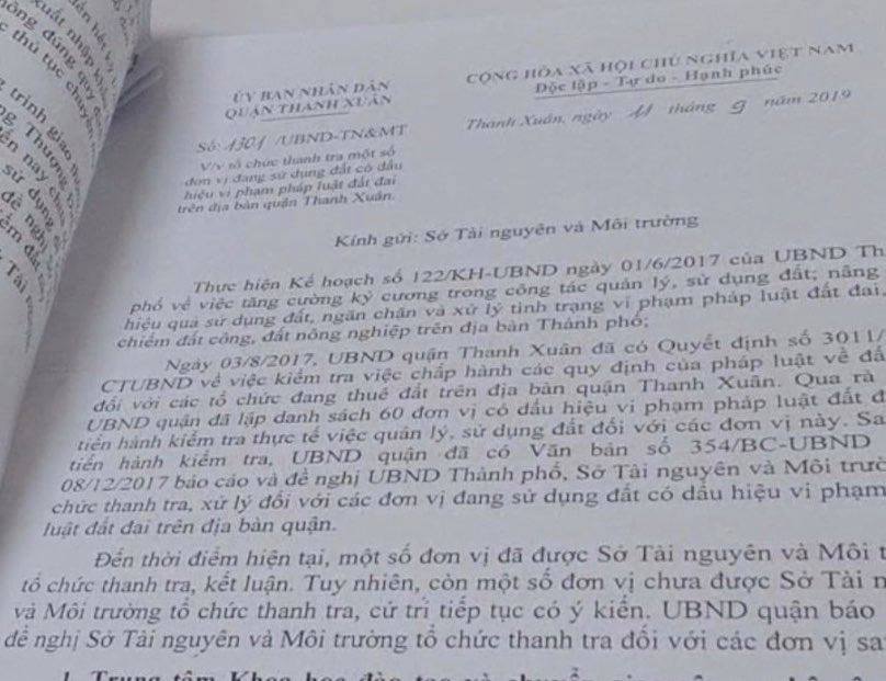 Liên quan đến việc quản lý sử dụng đất sai mục đích, UBND quận Thanh Xuân đã kiến nghị lên Sở TN&MT Hà Nội để thanh, kiểm tra những sai phạm trong văn bản số 1301/UBND -TN&MT ngày 11/9/2019 về việc tổ chức thanh tra một số đơn vị đang sử dụng đất có dấu hiệu vi phạm pháp luật trên địa bàn quận Thanh Xuân.