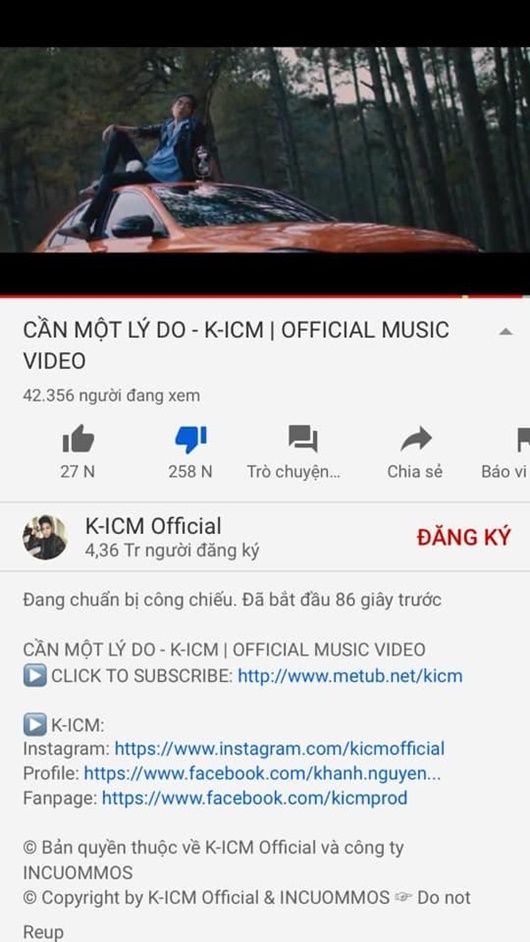 “Chúng tôi mong muốn sản phẩm được đón nhận ở góc độ âm nhạc. Dù biết rằng việc phát hành MV vào thời điểm này sẽ gặp nhiều ý kiến trái chiều của dư luận, nhưng không còn cách nào khác vì bản thân K-ICM vẫn phải duy trì công việc của một nghệ sĩ”, đại diện của anh nói thêm.