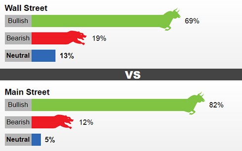 Cụ thể, trong cuộc khảo sát Wall Street, có tới 69% chuyên gia trả lời đưa ra dự báo giá vàng sẽ tăng, 19% dự báo giá sẽ giảm và 13% quan điểm trung lập. Còn đối với cuộc khảo sát trực tuyến Main Street, có tới 82% ý kiến dự báo giá vàng tăng, 12% dự báo giá giảm và 6% trung lập.