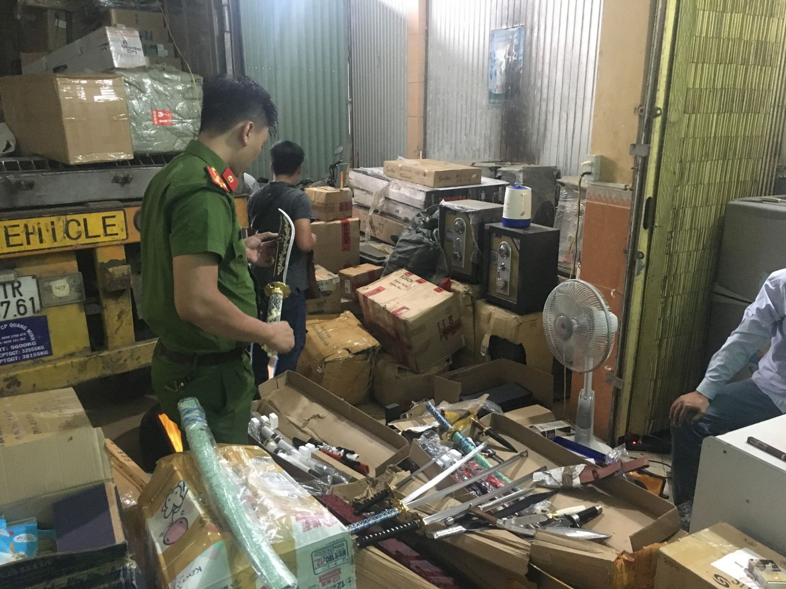 Qua kiểm tra, lực lượng Công an phát hiện trên xe đang chở nhiều loại vũ khí thô sơ gồm dao, kiếm, dao găm,.. và một số hàng hóa nhập lậu khác như quần áo, sữa, đồ chơi trẻ em, giày dép.